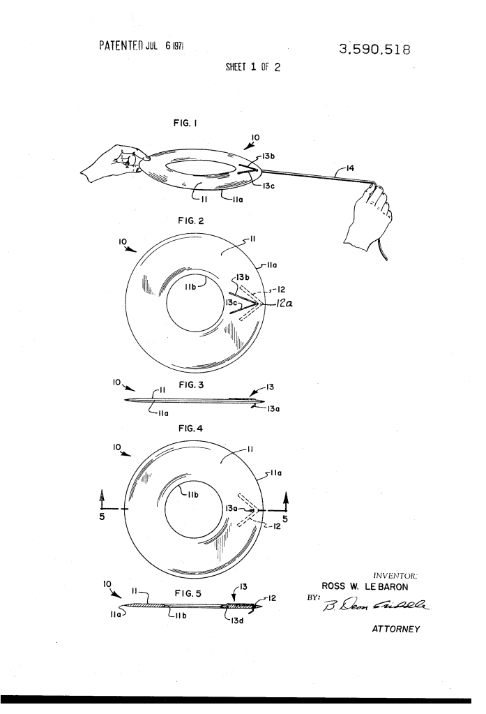 In 1971, a patent was published for a “Flying saucer craft”, created by Ross W. LeBaron years before. The assignee was Wham O Mfg. Co. The “Flying saucer craft” was a type of frisbee that had a hook for launching. According to the inventor,