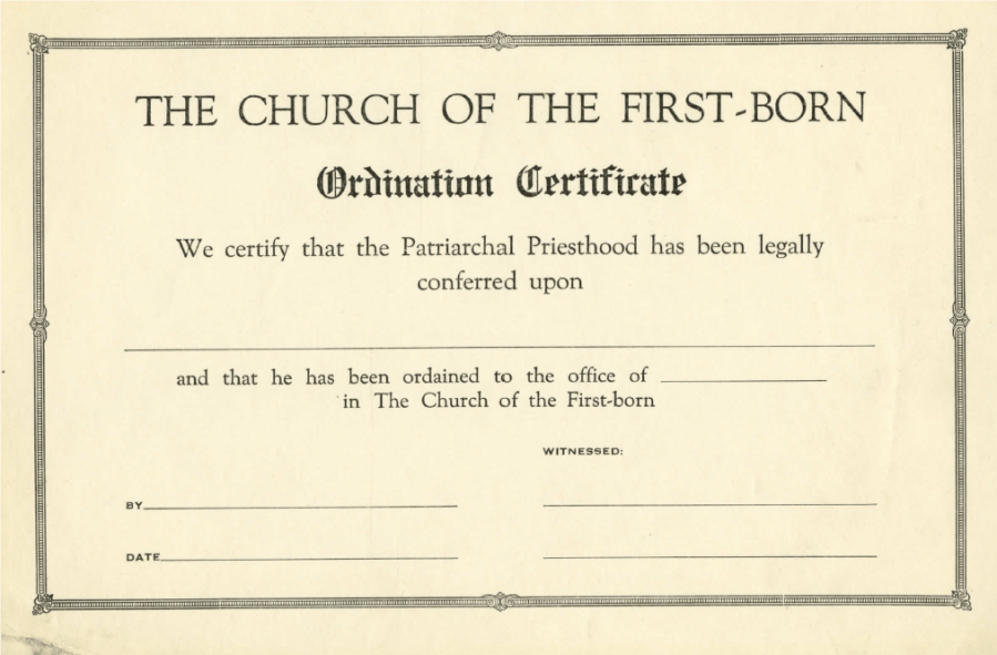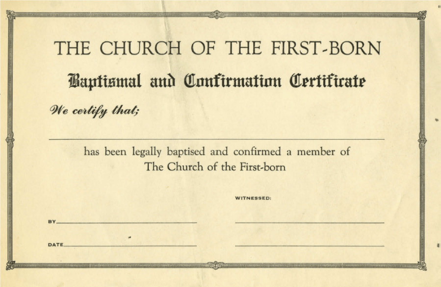 These are two certificates of The Church of the First-Born. We haven’t been able to determine the date of these documents or for how long they were used by Ross Wesley LeBaron and his followers.
