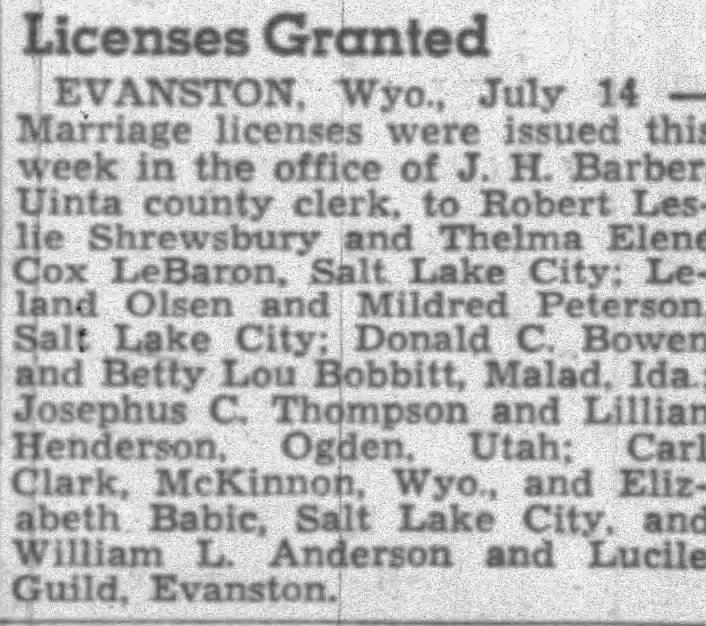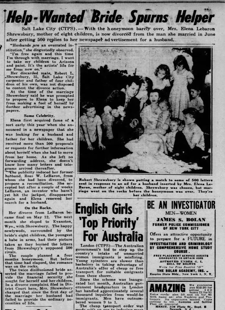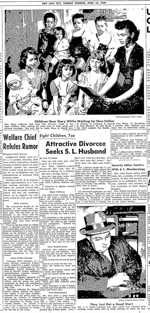 After divorcing Ross Wesley LeBaron in 1948, Thelma Elena Cox LeBaron made some headlines looking for a new husband. “Mrs. LeBaron would like to get a new husband to help support the home and her children so she can find some time to paint”, stated a front page report in the Salt Lake Telegram, in April, 1949. Her main concern was the scarcity of money and food. “Attractive Divorcee Seeks S[alt] L[ake] Husband” was the headline.